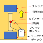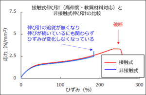 引張試験におけるひずみを正確に測定するためには伸び計による測定が必要です。中でもゴムのような伸びの大きな材料のひずみを測定する際は、高伸度・軟質材料対応の接触式伸び計が有効です。