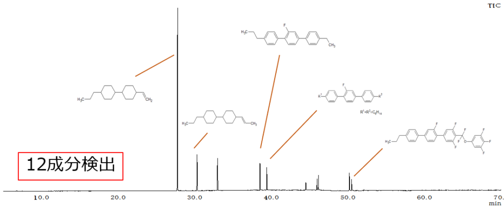 液晶ディスプレイには、製品用途に合わせた機能をもつ液晶分子が複数用いられています。GCMS分析ではそれぞれの成分を分離し、分子量や構造などの情報を得ることができます。分離したそれぞれの成分の分子構造から、液晶の特徴や機能を推定する、また不純物の有無や含有成分の差を比較するなど、目的に応じた分析が可能です。