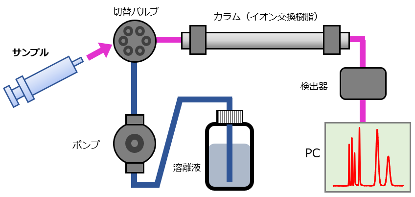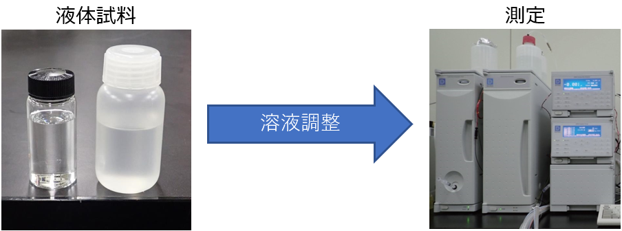 固体表面も溶液抽出することでイオンクロマトグラフにて測定が可能です。数cm角以上の試料表面について平均的なデータが得られるので、プリント基板などの平板試料の相対比較に適しています。ここでは液体試料と固体表面の分析の流れを示します。
