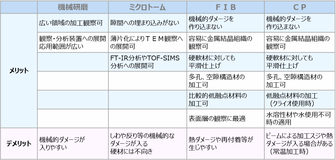 cross_section_merit_demerit Published 2020年4月7日 at 1111 × 530 in 断面観察前処理(試料切断・樹脂包埋) 機械研磨、ミクロトーム、FIB、CPそれぞれの加工のメリットとデメリット