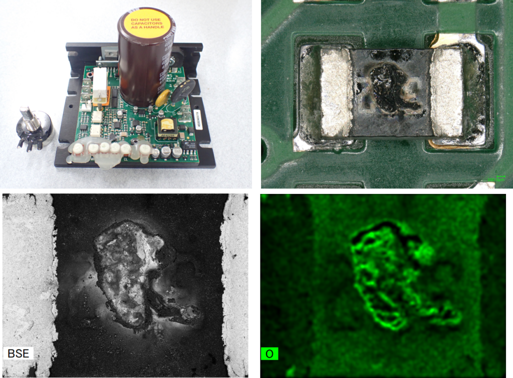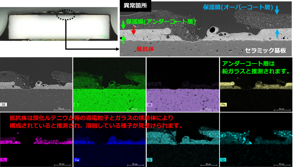 チップ抵抗の故障解析例 研磨台の動作不良の原因調査を行ったところ、該当基板のチップ抵抗に異常が確認されました。本資料では異常が見られたチップ抵抗の故障解析例を紹介致します。 表面観察 チップ抵抗に異常が確認され、保護膜が溶融している様に見受けられます。EDXによる元素分析では異常部からAlやPb等が検出され、アンダーコート層等が露出している可能性が疑われます。 断面観察 続いて機械研磨により断面試料を作製し、SEM/EDXによる解析を行いました。 保護膜や抵抗体が溶融している様子が観察されました。オーバーコート層が破壊されたことで、アンダーコート層などが表面から観察された様で、サージもしくは過負荷により耐熱温度を超えて発熱したため抵抗体等が溶融し、抵抗値が変化した(オープンに至った)のではないかと思われます。 本資料では機械研磨、SEM、EDXによる加工、観察手法を紹介致しましたが、アイテスでは蓄積されたノウハウにより観察目的や試料の組成、構造に応じた加工、前処理、観察手法や組み合わせを検討、ご提案致します。ご相談等、お気軽にお問い合わせ下さい。 お問い合わせはこちらから 株式会社アイテス 品質技術部 TEL:077-599-5020 メールでのお問い合わせはこちらから